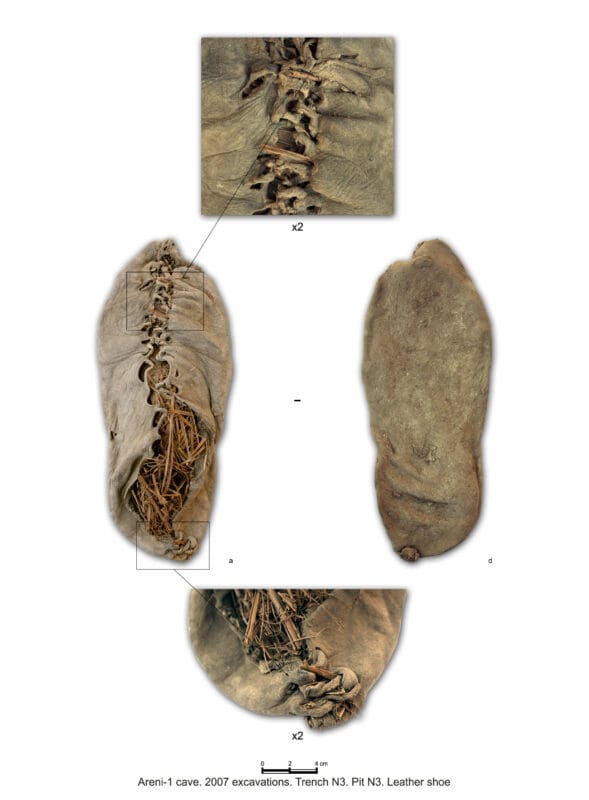 In de Areni-1 grot in Armenië ontdekten archeologen de oudste leren schoen die ooit is gevonden, daterend uit 3500 v.Chr. Met meer dan 5.500 jaar is dit het oudste exemplaar van leerbewerking ter wereld, wat de lange traditie van Armeens vakmanschap op het gebied van schoeisel en textiel aantoont.